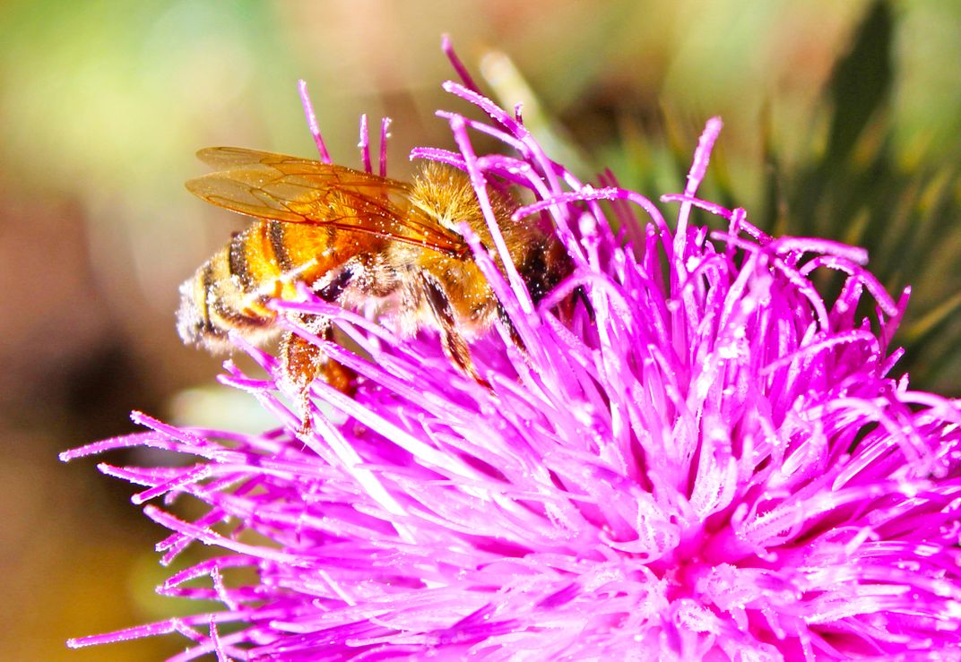 Busy Honeybee (Apidae-Hymenopterans) feasting at a milk thistle.