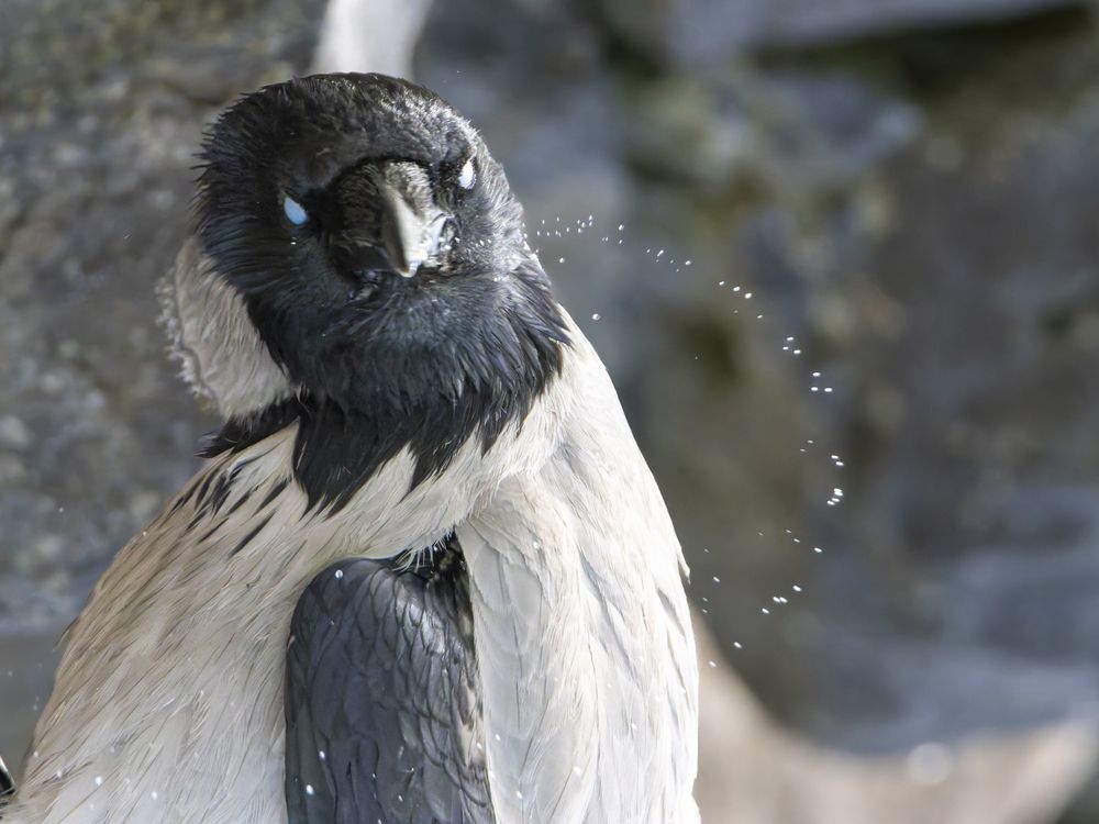 Grey body with a distinctive black head, tail and wings. Its intelligence and mystery as a symbol in various cultures. In tune with its surroundings, a creature of ancient lore.