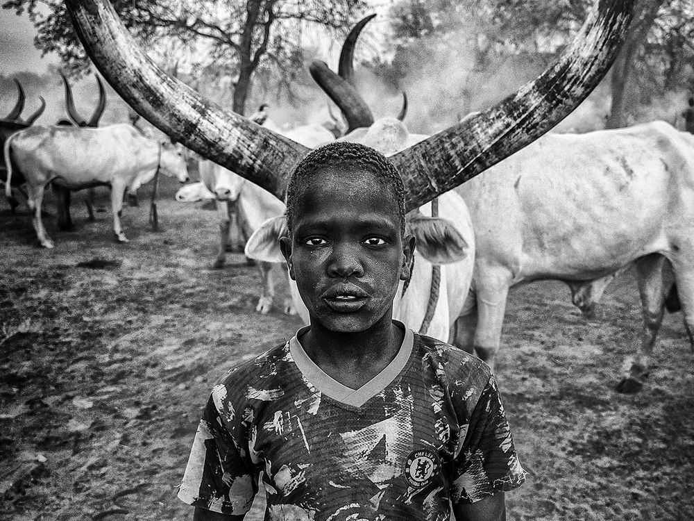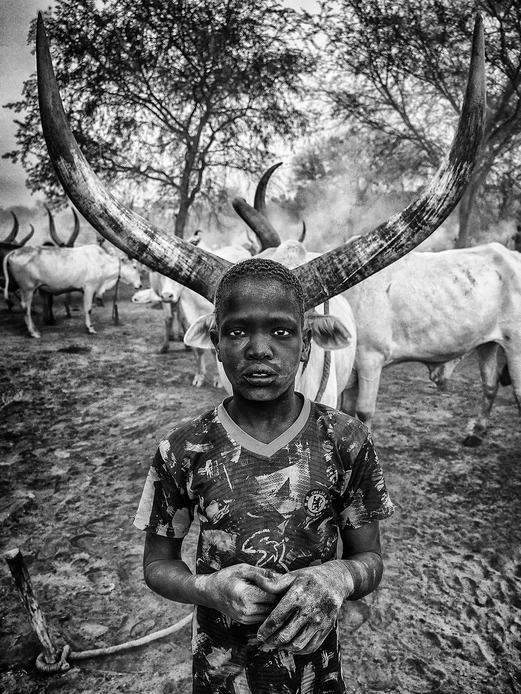 A boy from the cattle camp of the Mundari people. Their ankole cattle are known for their large horns