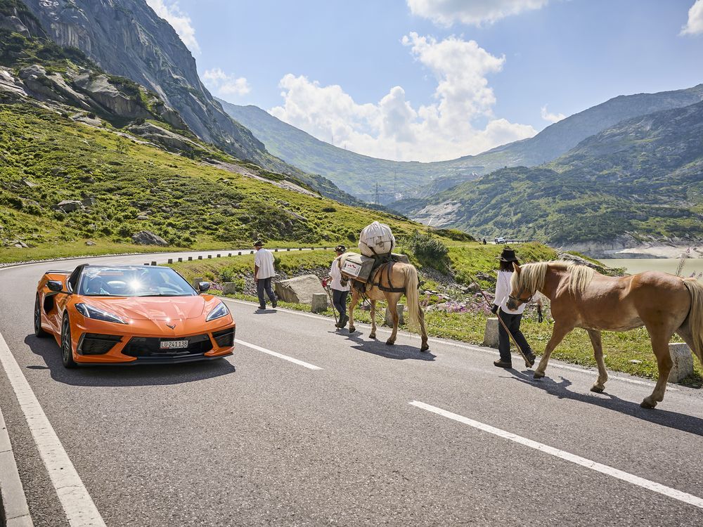 Different horsepower: On the Grimsel Pass road, the past meets the present. The Grimsel Pass road connects the Swiss cantons of Lucerne and Graubünden. It is 1,800 meters above sea level.