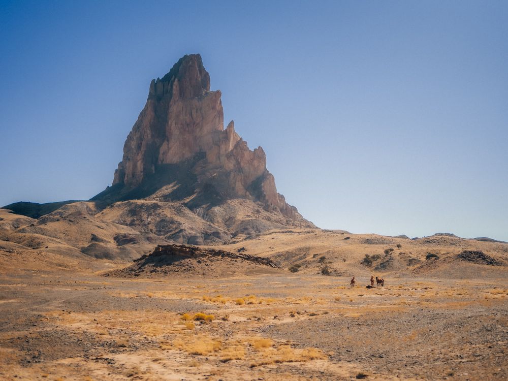 A quiet band of wild horses moves across an open plain beneath a towering monolith—space, light, and the long breath of the West.