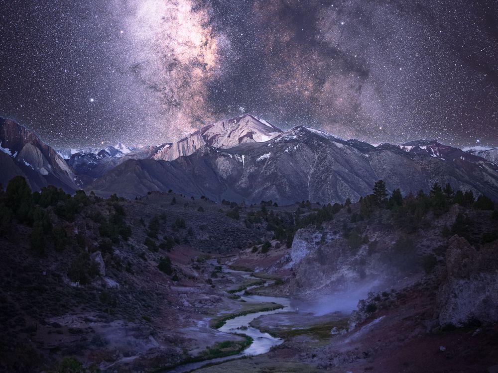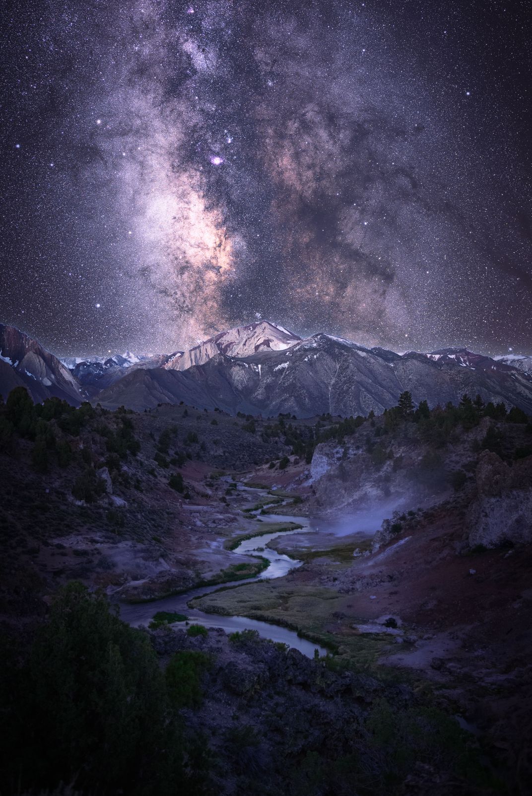 An early, cold (30°F) morning alongside a group of enthusiastic photographers yielded wonderful results, as the Milky Way stood tall above Hot Creek Geologic Site.
