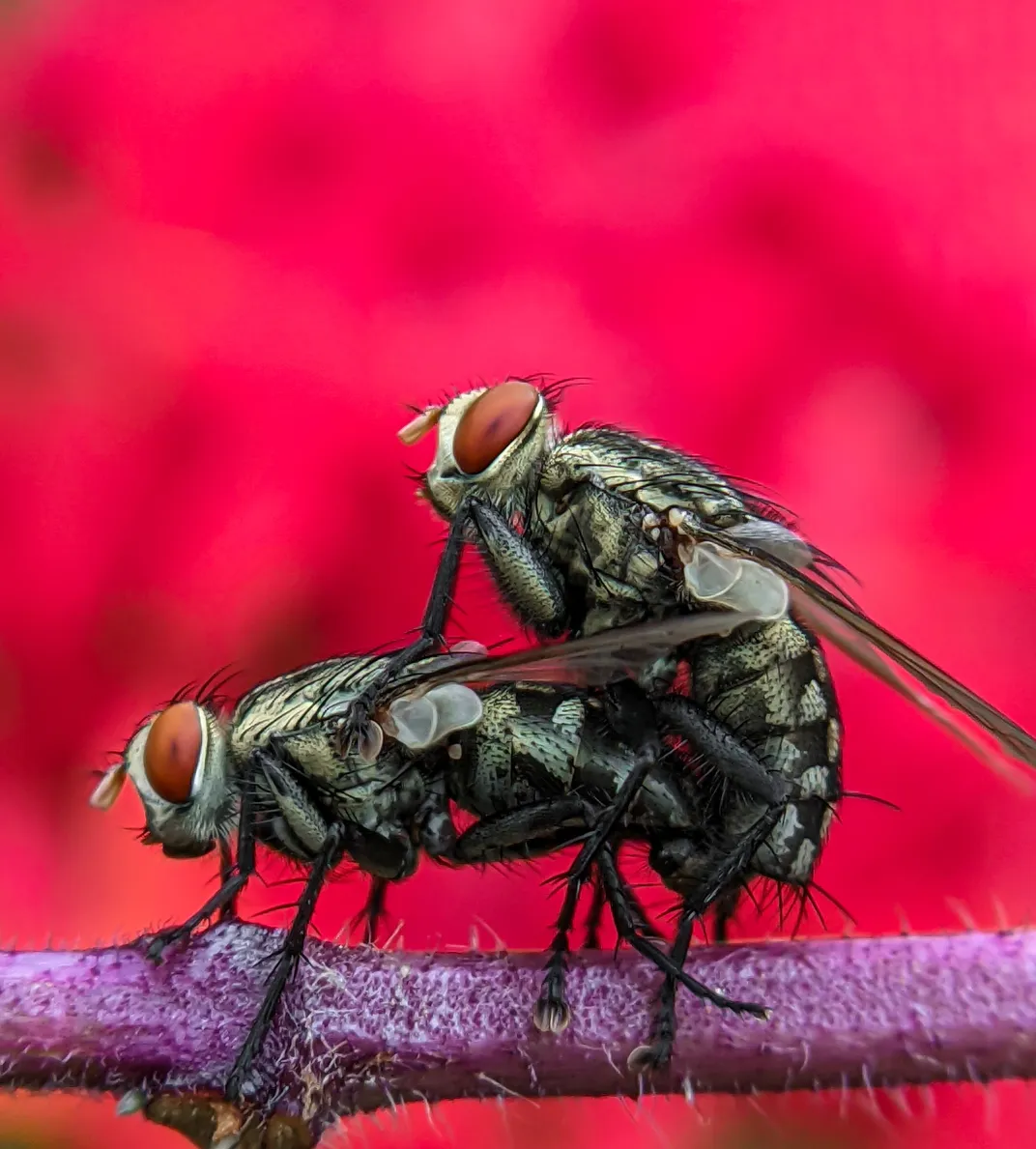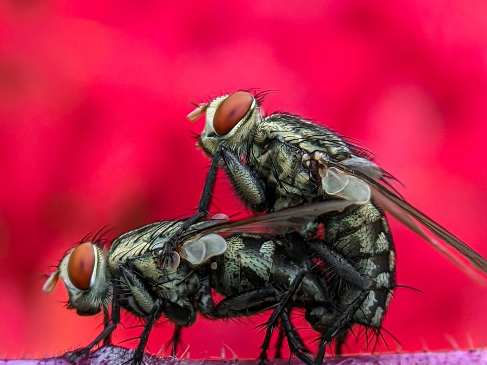 Housefly mating in front of a red flower. So the background is red