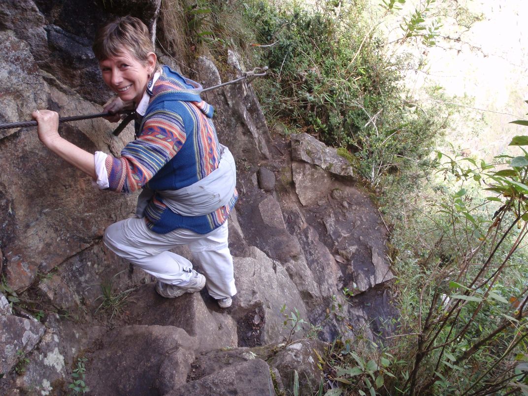 How Did You Talk Me Into This! Shirley climbing to the top of Wayna Picchu at Machu Picchu, Peru. One slip, and it's a long way down!