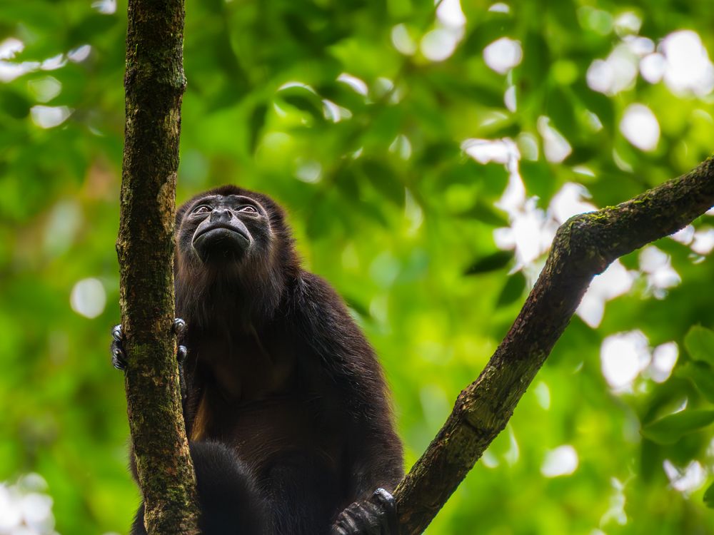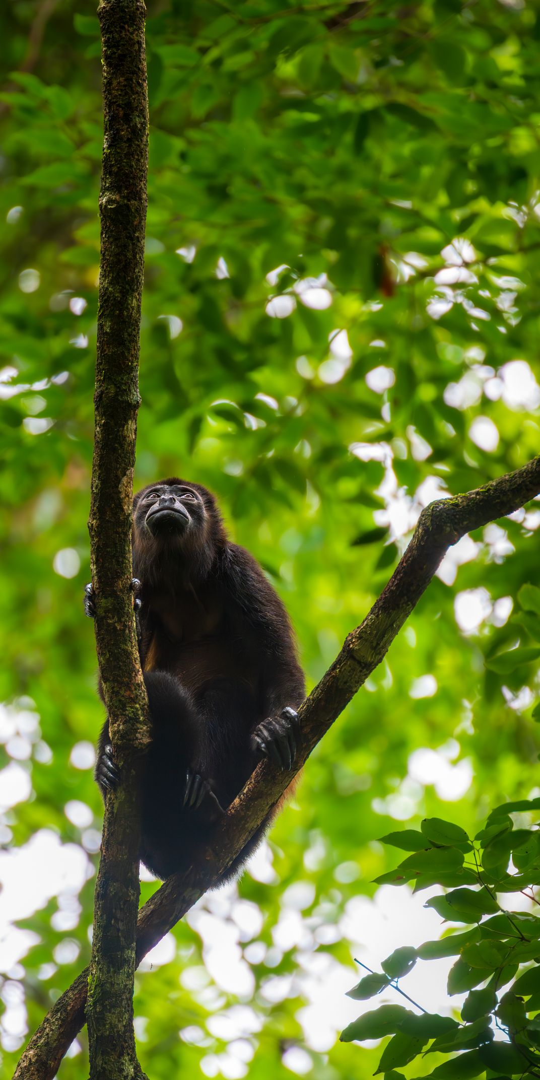 A group of howler monkeys was moving through the thick canopy on the Osa Peninsula on Costa Rica's Pacific coast. Howlers are one of four species of monkeys in Costa Rica and all four species are found on the Osa Peninsula. This howler was effortlessly scaling the vertical branch when he briefly paused where these two branches intersected. His gaze upward before he continued to climb caught the light and is strikingly human.