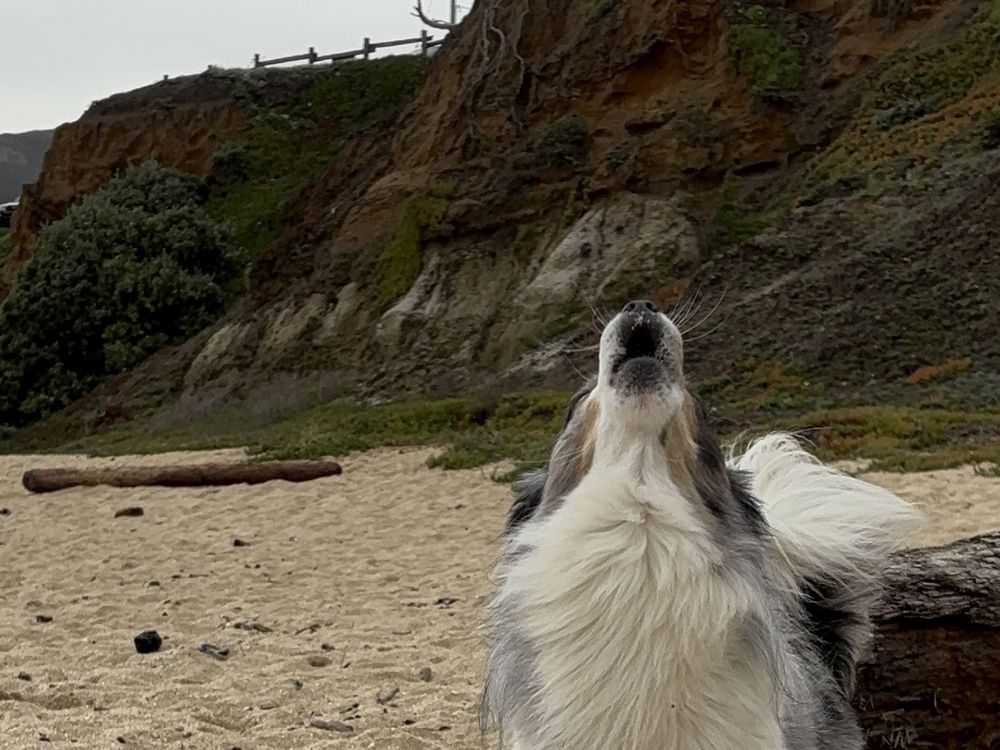 Dog howls at the the sky while owner walks the beach