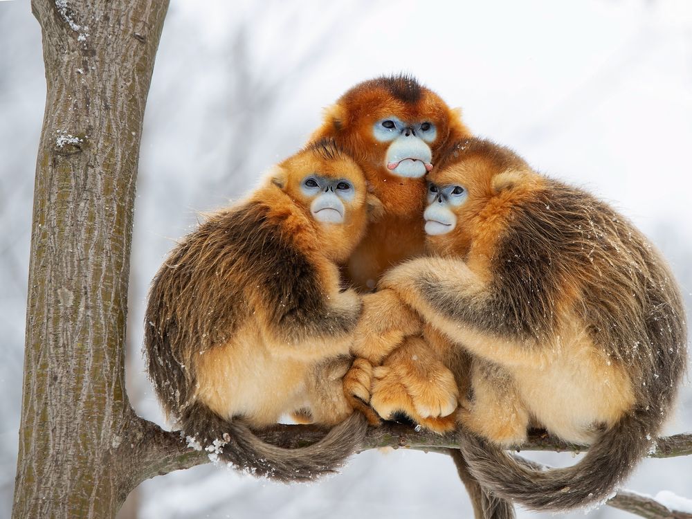 China, Shaanxi, November 2020. A snow-covered, cold day finds golden snub-nosed monkeys huddling together for warmth