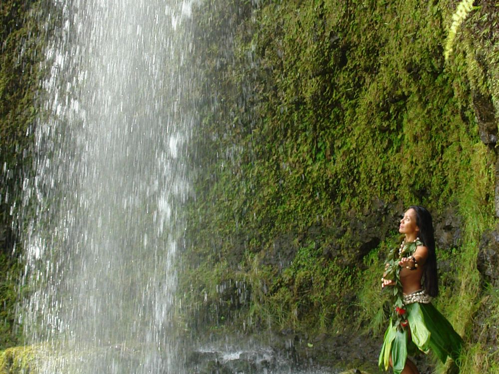 Hula under Kapoloa Falls, Hawaii.