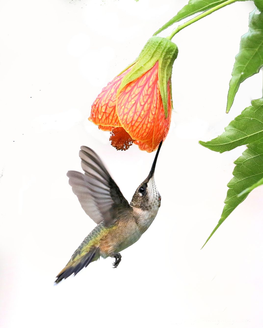 I was out in my garden when morning and noticed a hummingbird feeding on a Chinese lantern Blossom. I quickly went in to get my camera by the time I have returned the bird was gone. I waited a while and sure enough the bird returned to get its morning fix of nectar. Able to capture this image using my house backdrop creating a white background.