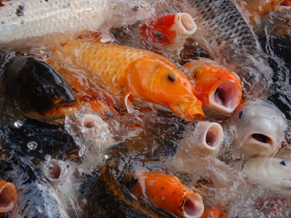 Hungry fish with their mouth wide open.