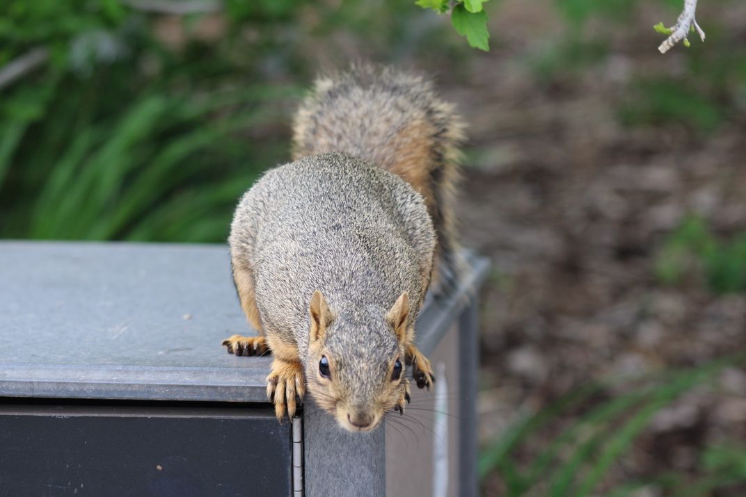 This photo was taken at the Denver Zoo. The squirrel was wandering around and stopped on a trash can to look around.