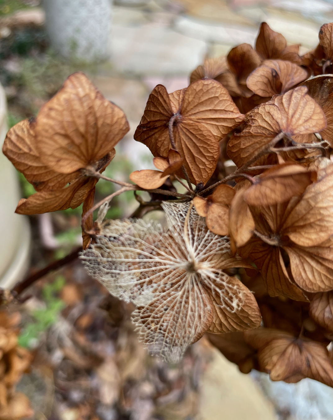 Hydrangea flower in my garden that featured one lacy leaf, apparently chosen for ornamentation by a determined chewing insect.