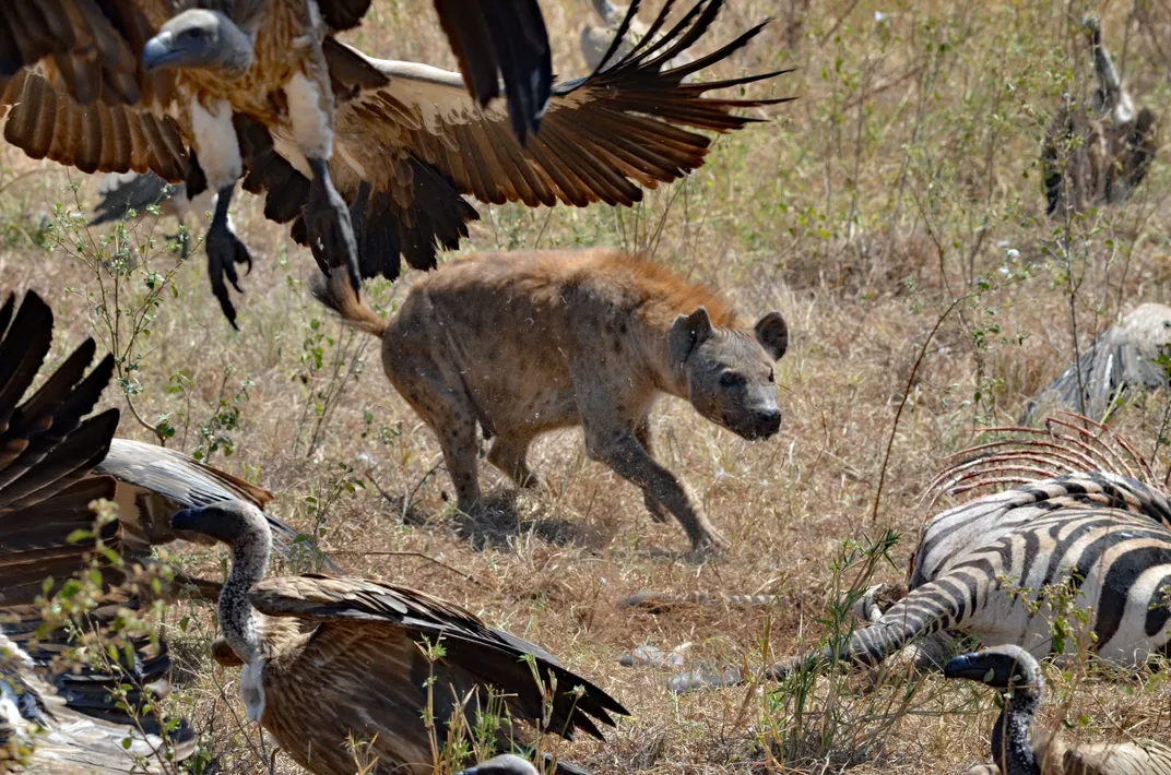 Every time this hyena would look away, a flock of vultures would come down and try to eat from the zebra carcass so the hyena would start running around howling and charging at the birds to chase them away.