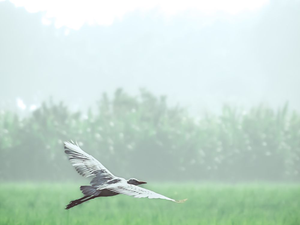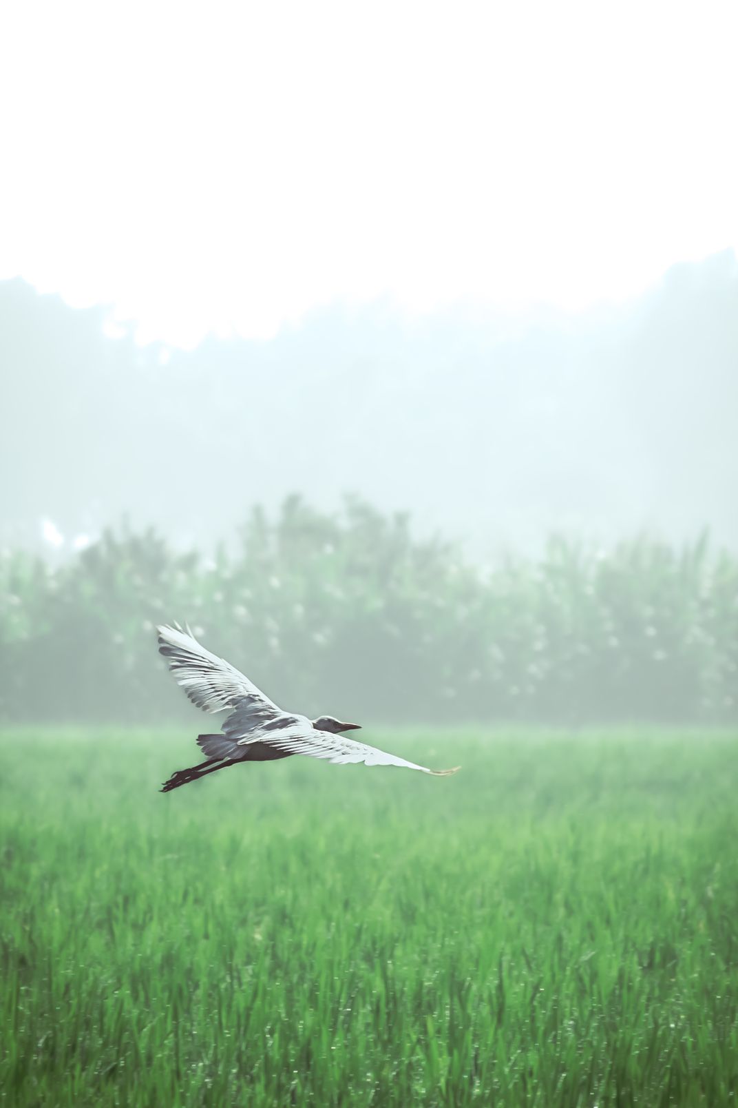 A photograph documenting a bird in flight amidst the green crops in the early morning in an Egyptian rural village.