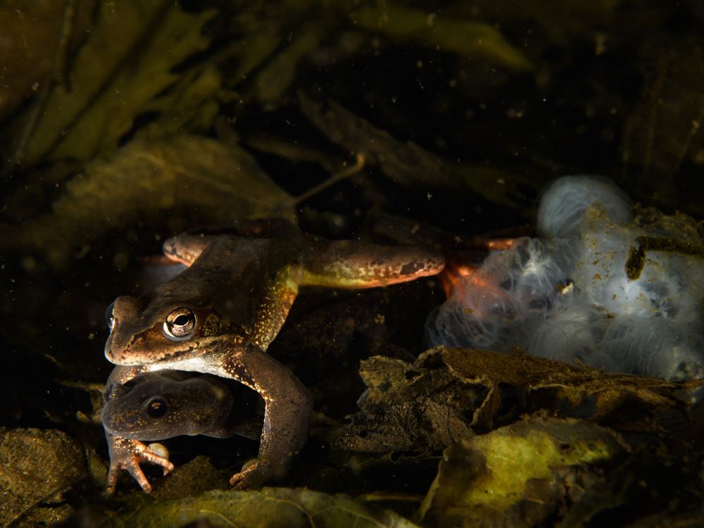It was a interesting situation to see a breeding season ezo brown frog (Rana pirica) holding hokkaido salamander (Hynobius retardatus), and the salamander moving a little but staying quiet. The salamander was here to guard their eggs.