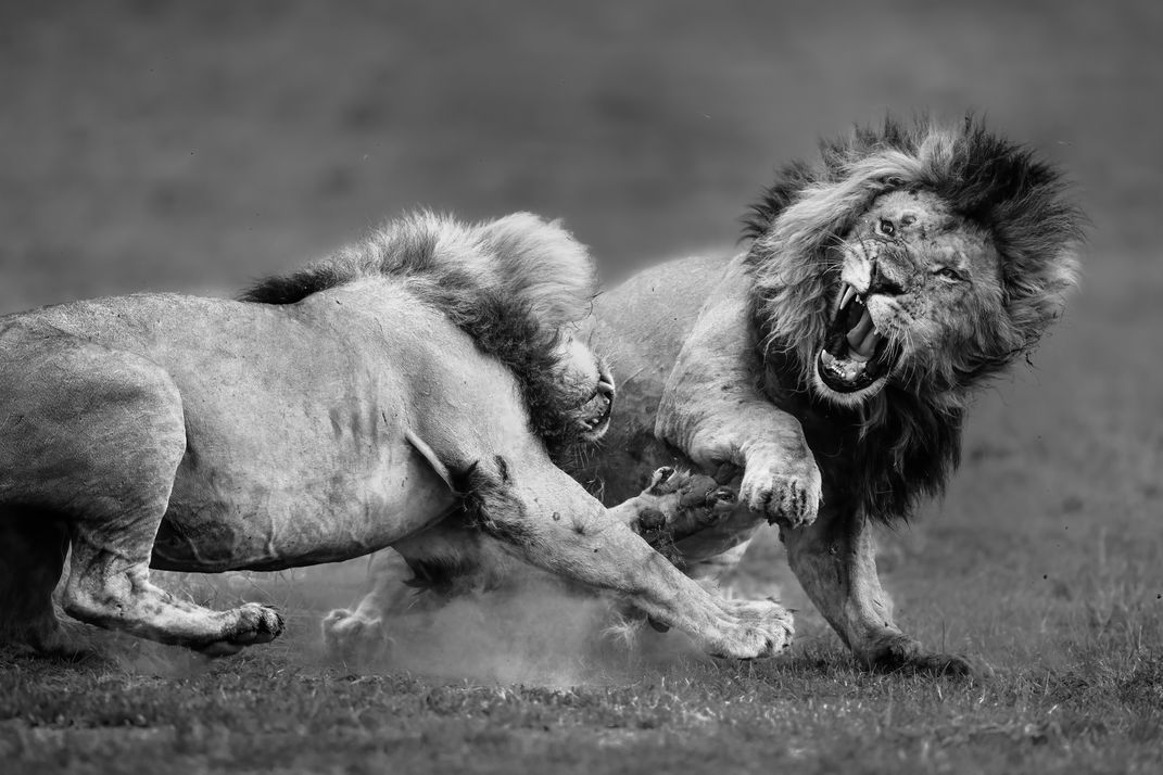 The sun was just about to rise when we found the Enkoyanai pride of the 2 black-mane lions. Olonyokie was feasting on a wildebeest kill while Olobor was resting nearby, keeping a strong eye on a lioness. A few jackals were circling around, waiting for a chance. During most of the following hour, Olonyokie had the carcass all to himself, taking naps in between meals while Olobor was busy mating with his lioness. Jackals had no success stealing anything from the lions but had kept their audience entertained with their persistence. About an hour after sunrise, Olobor finally decided that it was about time for breakfast. He walked toward Olonyokie, greeting his brother by rubbing his head. As Olobor turned toward the carcass, our eyes met briefly through my lens. He doesn’t have the friendliest face and somehow reminds me the bad uncle Scar of Simba in The Lion King. To my surprise, Olobor stood up and walked toward Olonyokie just a few minutes later. The shock, disagreement, and maybe a little fear on Olonyokie’s face signaled the following drama I was going to witness. Suddenly, both males had their mouths wide open. Olobor put his front legs on Olonyokie’s head. As mad as Olonyokie, he seemed to just try avoiding the attack from Olobor without fighting back. The entire conflict lasted for only 3 seconds. After that, Olonyokie walked far away from the carcass to the other side of the field.