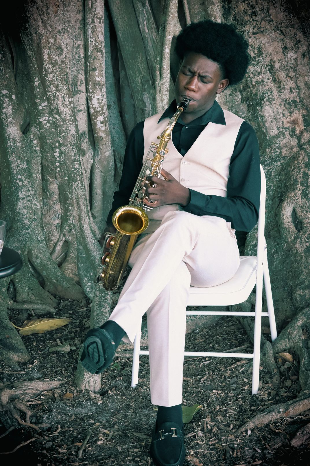 This photo captures a musician playing saxophone outdoors, seated in front of a large tree with deep, twisting roots. His focused expression and formal outfit create a soulful contrast with the natural, earthy setting.