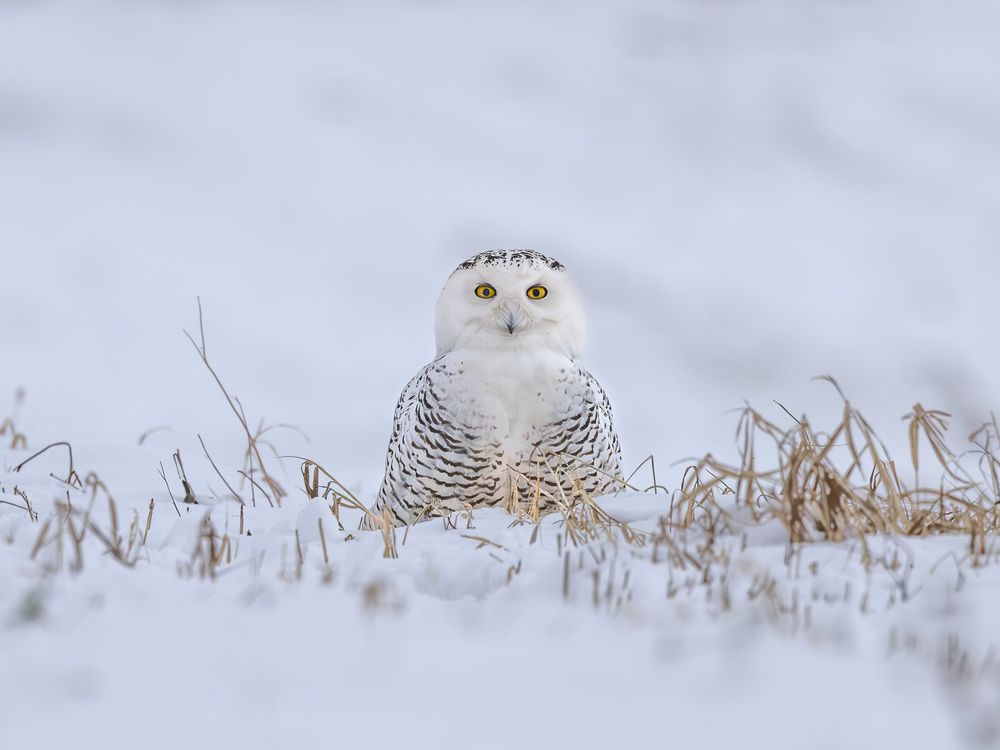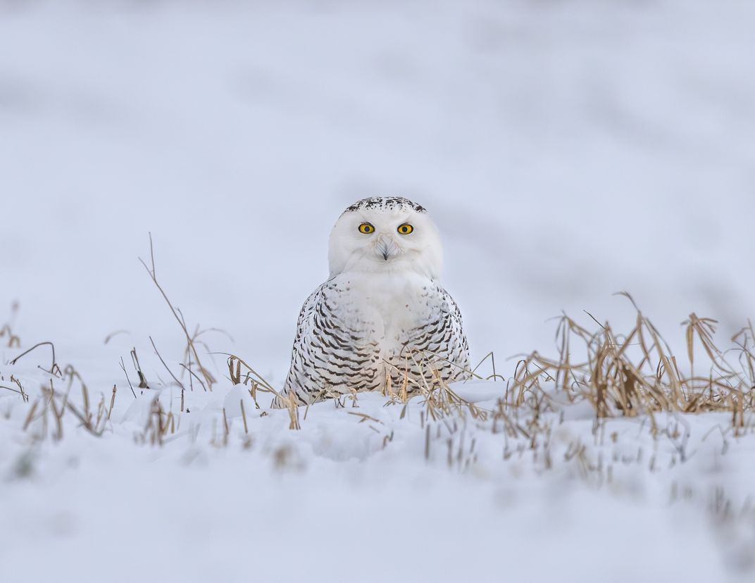 Snowy owl pops it's head up as it hears prey in a nearby field.