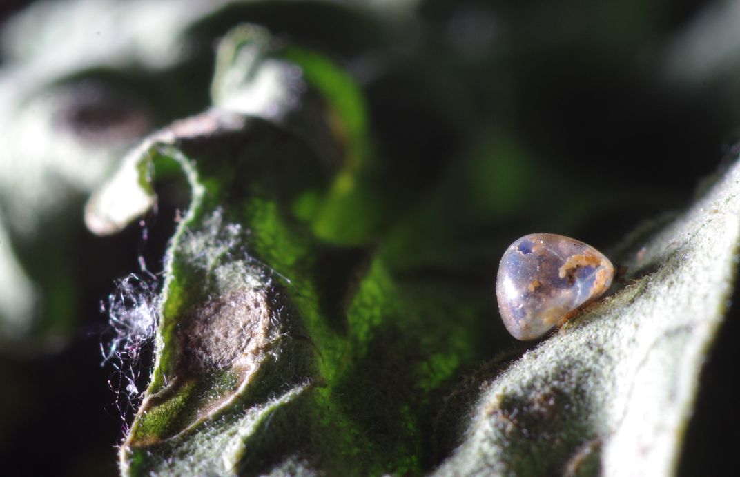 I think this is a squash bug egg. It seems as though something got to it before it hatched, judging by all the particles still in the egg.