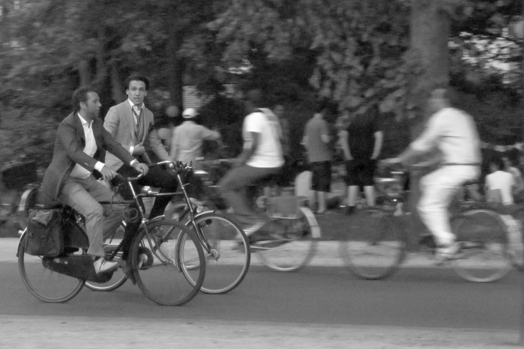 I was in Vondelpark in Amsterdam and I decided to photograph the bikers because that is one of the things the Netherlands is known for. This was my favorite one: 2 businessmen having a discussion as t