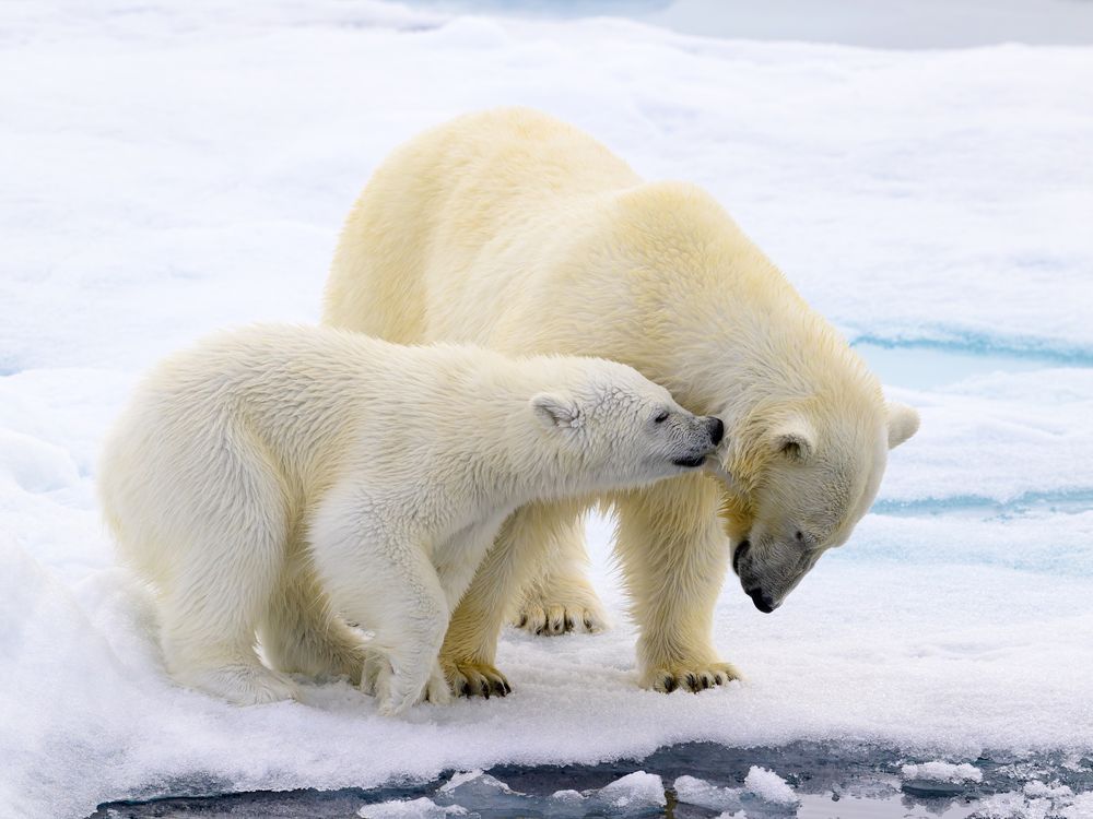 A polar bear mother and cub interact tenderly on the pack ice at approximately 81 degrees north latitude, north of Svalbard.