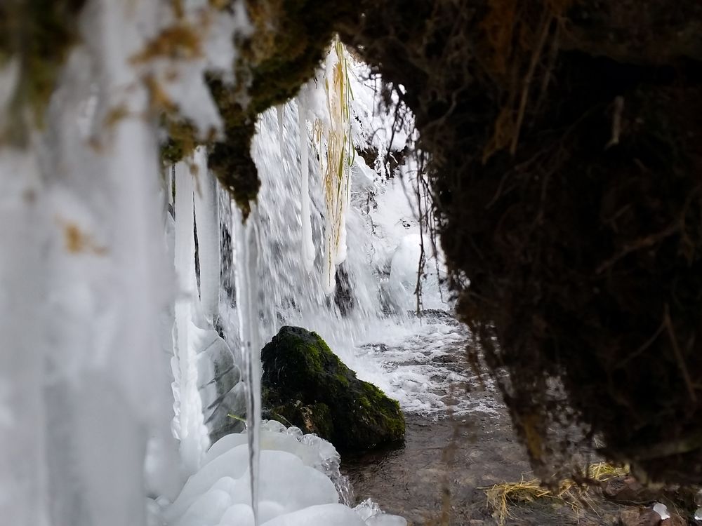 These longer Icesicles formed under this riverbank beside a six foot tall waterfall.