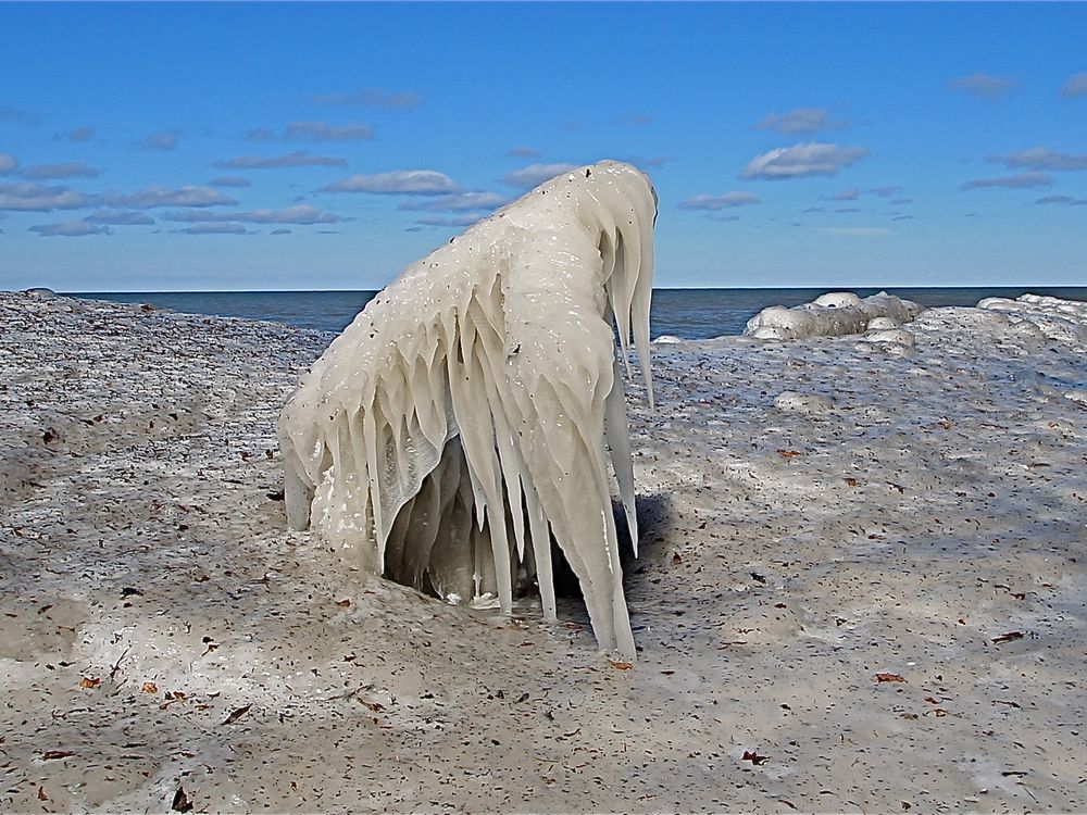 I was checking out one of my best areas of Lake Ontario shore line after a storm. When I saw it. A creature rising from up from the ice sheet.