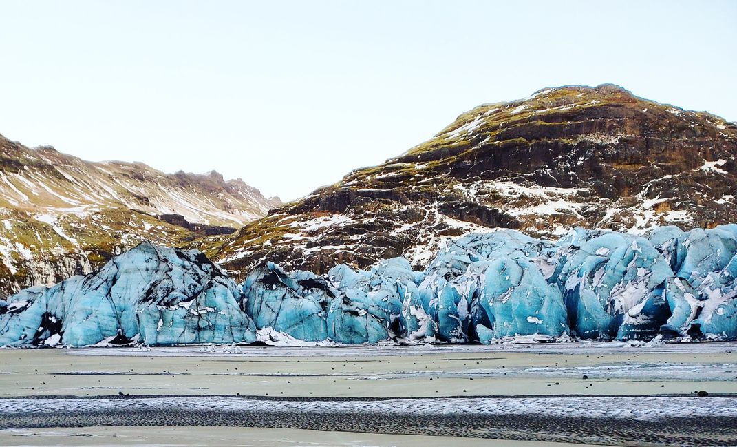 We were on a tour group hike on the Sólheimajökull glacier with the nicest Australian tour guide. This was in the background in the area where we put on our crampons. It was a fun photo shoot and happened to be on the winter solstice. The deep blue color is because of the age and compression of the ice.