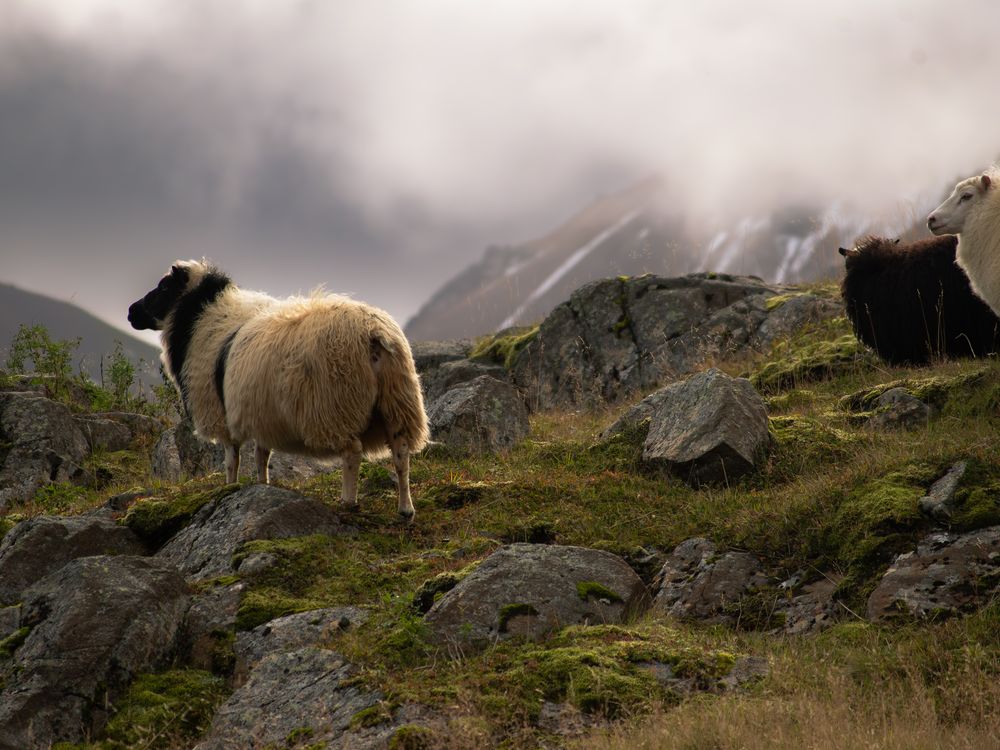 A small group of Icelandic sheep stands on the moss-covered slopes of Borgarfjörður Eystri as low clouds drift across the mountains. The stillness of the animals and the muted light capture the quiet character of Iceland’s Eastfjords landscape.