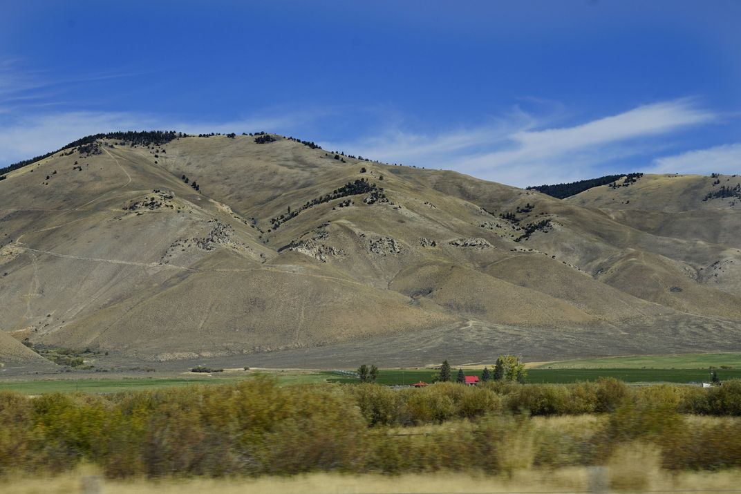 Mountains and grasslands along an Idaho highway with a distant hint of the color red from roof tops depicting a home out in the middle of nowhere. Living in Idaho without neighbors.