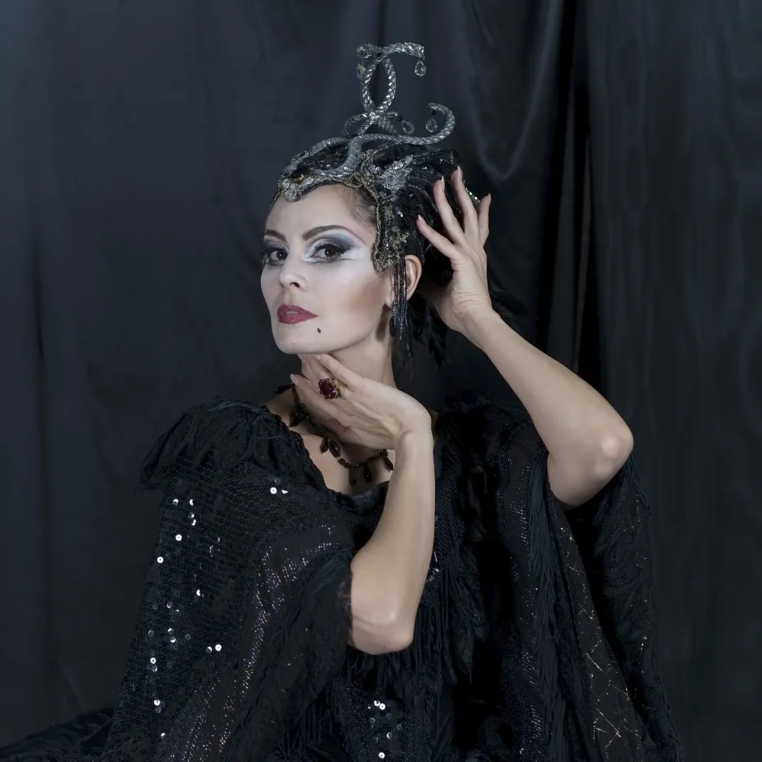 Igone de Jongh, ballerina with the Dutch National Ballet posing in the costume and make up of the wicked fairy ‘The ‘Carabosse’ from the ballet ‘The Sleeping Beauty’ in the studio in a small set I prepared.