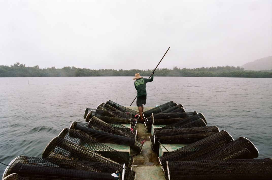 Israel Velez works on the oyster boat on the ancient Moli’i Pond at Kualoa Ranch. They are the first commercial oyster farm in Hawaii in several decades. I've spent the last several months documenting sustainable agriculture in our country.