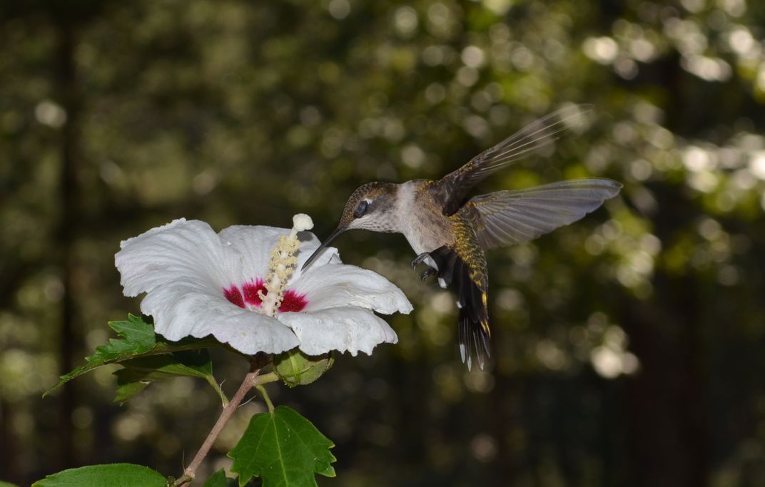 Immature male Ruby-throated hummingbird drinking nectar from a Rose of Sharon flower