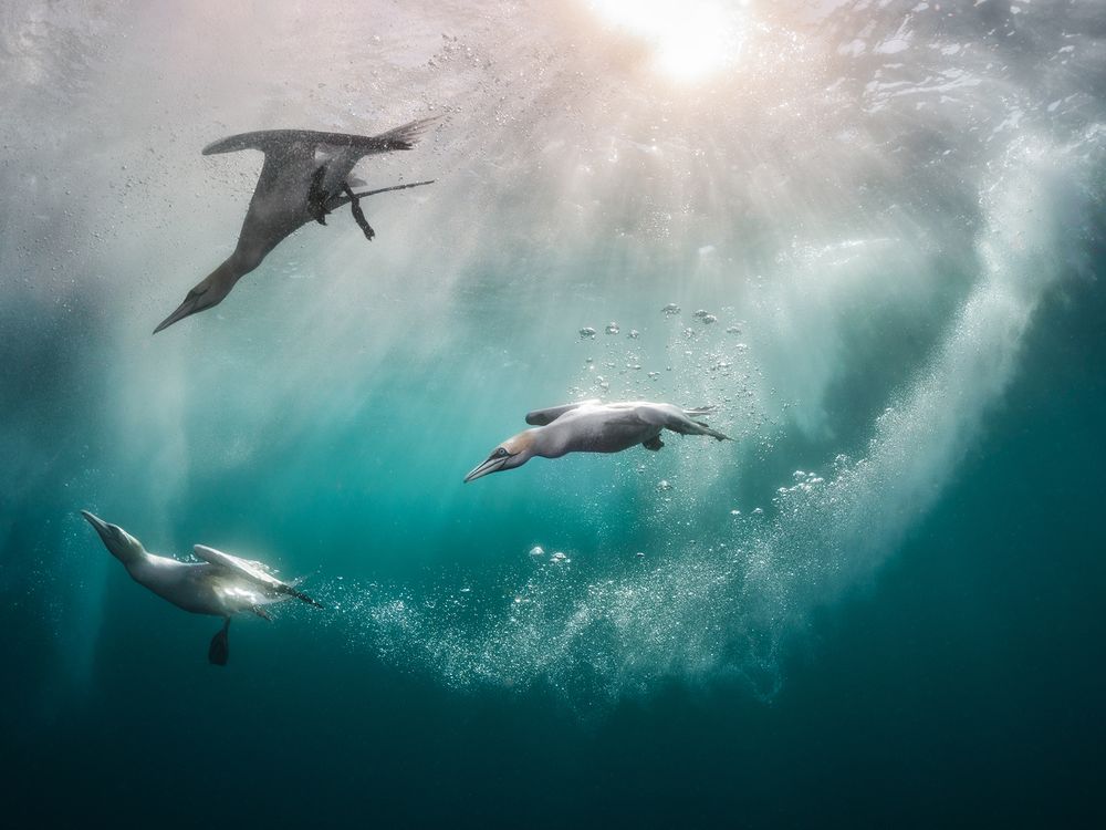 A trio of Northern Gannets diving into the ocean on a sunny day in Shetland. The species is Scotland’s largest seabird, and they are remarkably adept in the water, with the ability to dive to depths as far as 22 metres. I took this photo while scuba diving from a boat near Noss, which is home to the UK’s seventh largest colony of Northern Gannets. In the past the population has been estimated at around 25,000 birds, though their numbers were unfortunately severely reduced by the avian flu outbreak. It is unclear when, or if, their population will be able to recover.