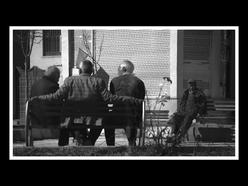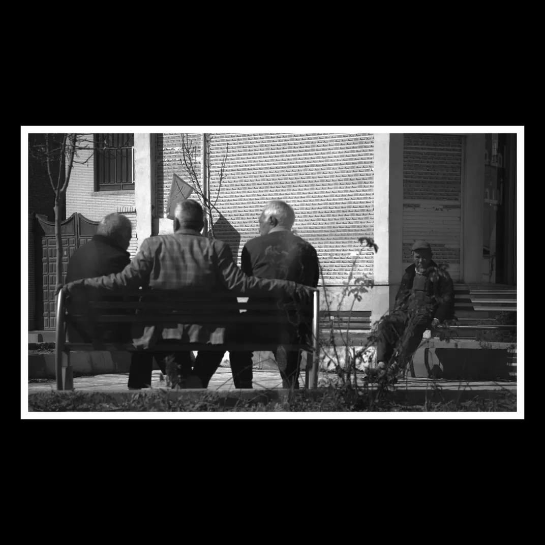 The Afghan immigrant man sits alone, watching other men sitting together and talking.