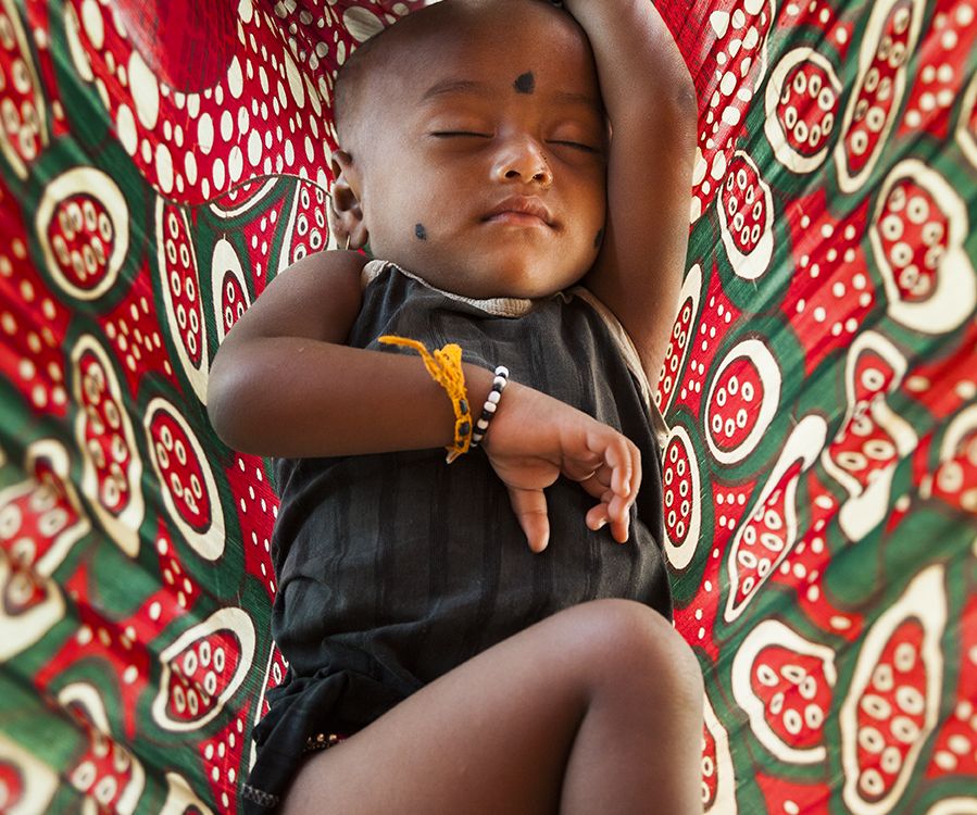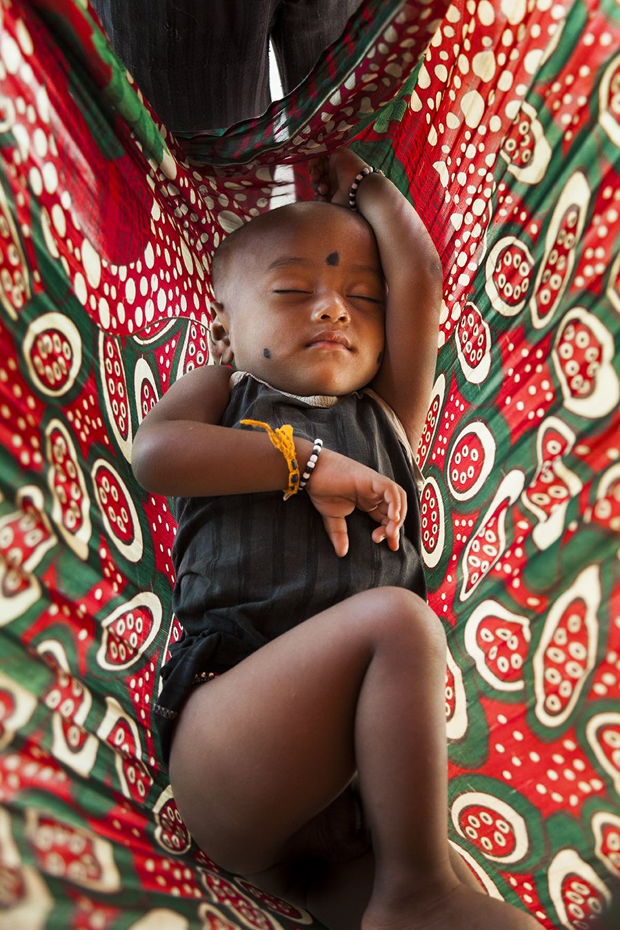In a village on the outskirts of Hampi, a baby boy takes an afternoon nap in a sarong suspended from the ceiling. He is wearing a bindi, a traditional forehead decoration applied between the eyebrows.