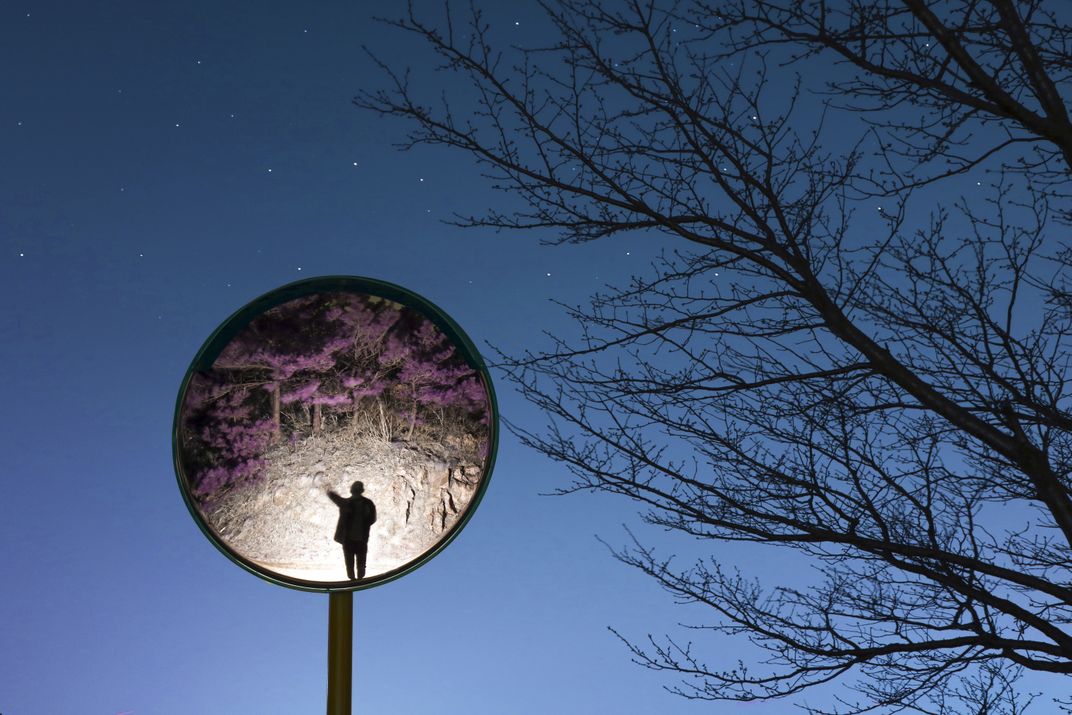 Quotes from the Truman Show Dark mountains, light mirror, and self-portraits with trees and stars.