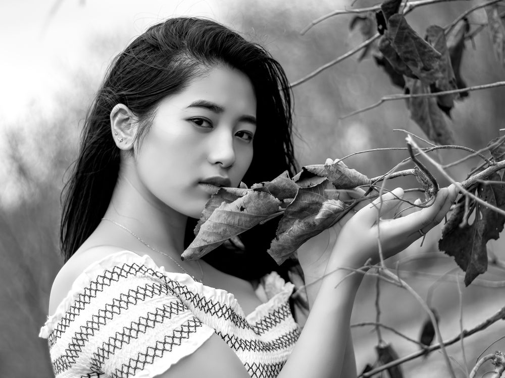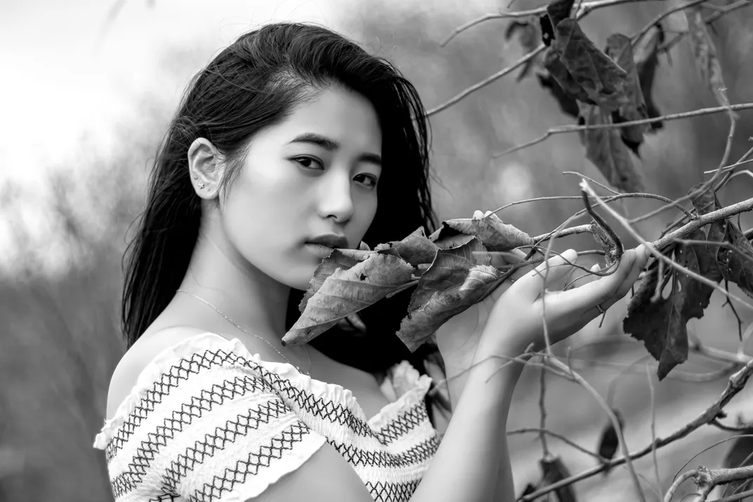 A moment captured in monochrome. She stands framed by the dry, textured branches of the late season, her gaze direct and contemplative. The stark contrast of the black and white emphasizes the delicate pattern on her off-the-shoulder dress and the subtle drama of the fading leaves she holds.