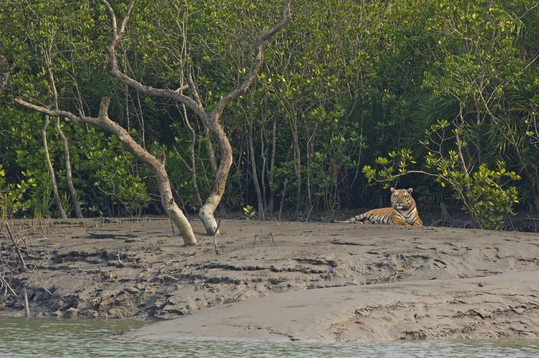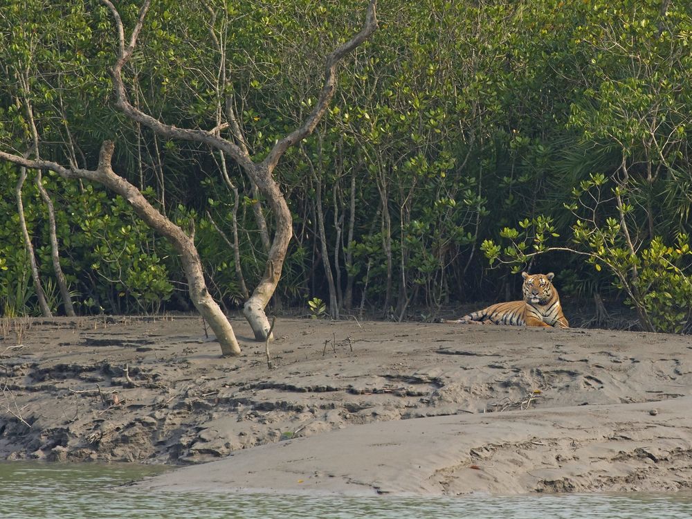 The image shows the phantom stalker of Sunderban (Royal Bengal Tiger) is sitting in the wide open on the mudflat in Sunderban Tiger Reserve.