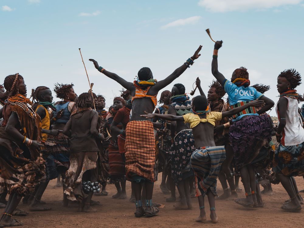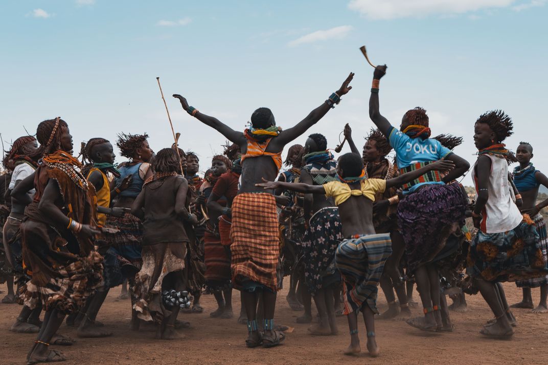 Women gather in a swirling circle of movement and dust, celebrating before the traditional bull-jumping rite near Jinka. Their rhythmic chants, vibrant attire, and powerful energy reveal a moment where community and tradition come alive.
