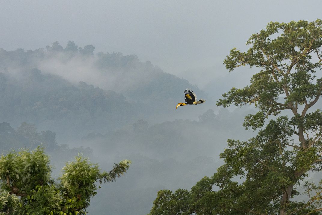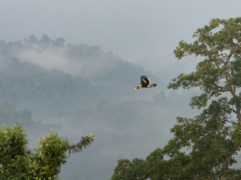 The mountains, draped in mystic hues, bear witness to the avian symphony—an orchestrated flight through the veiled corridors of time. The Great Hornbill, a guardian of the misty realms, becomes a living brushstroke against the canvas of the Anamala Tiger reserve, leaving an imprint of wild magic in its wake. The Great Hornbill becomes a fleeting vision—a winged guardian of secrets, an embodiment of the untamed spirit that calls Anamala home. As it disappears into the shrouded heights, the mountains hold their breath, cradling the echoes of its passage, a living legend in the misty embrace of ancient peaks.