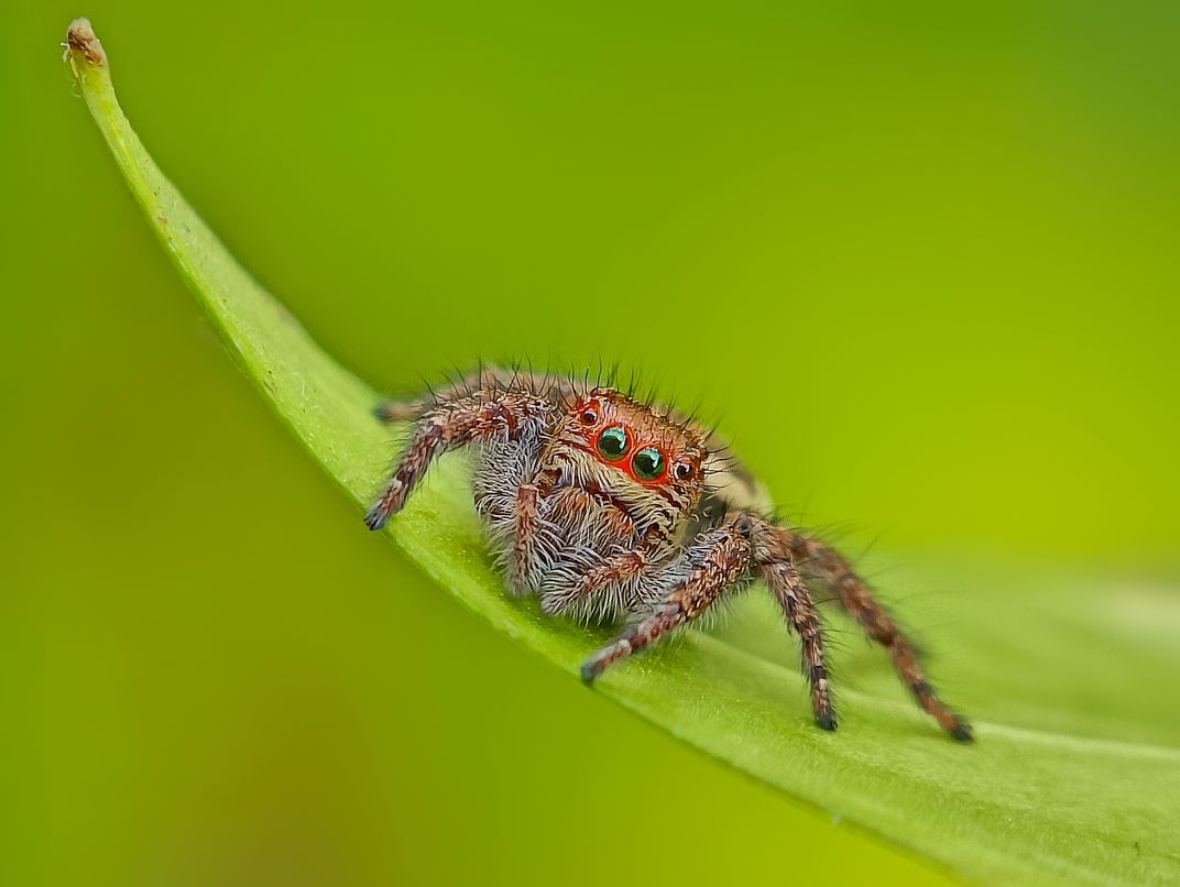 Found in tropical and subtropical woodlands,gardens,thick foliage of short trees & shrubs ; A female Carrhotus viduus, a species of spider in the family Salticidae captured while idling around the edge of the leaf.