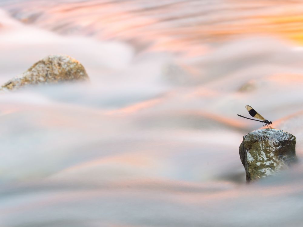 Reflection of sunset in a stream and damselflies in a torrent in Nankun mountain, Guangzhou.