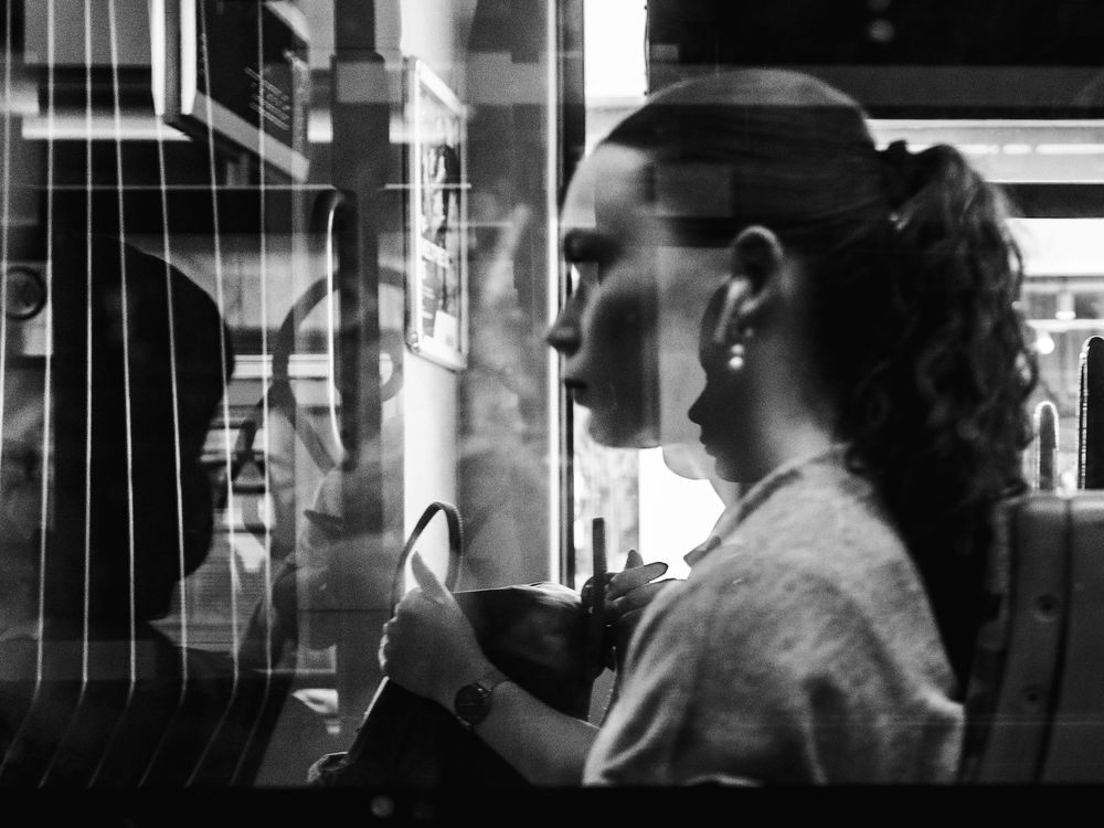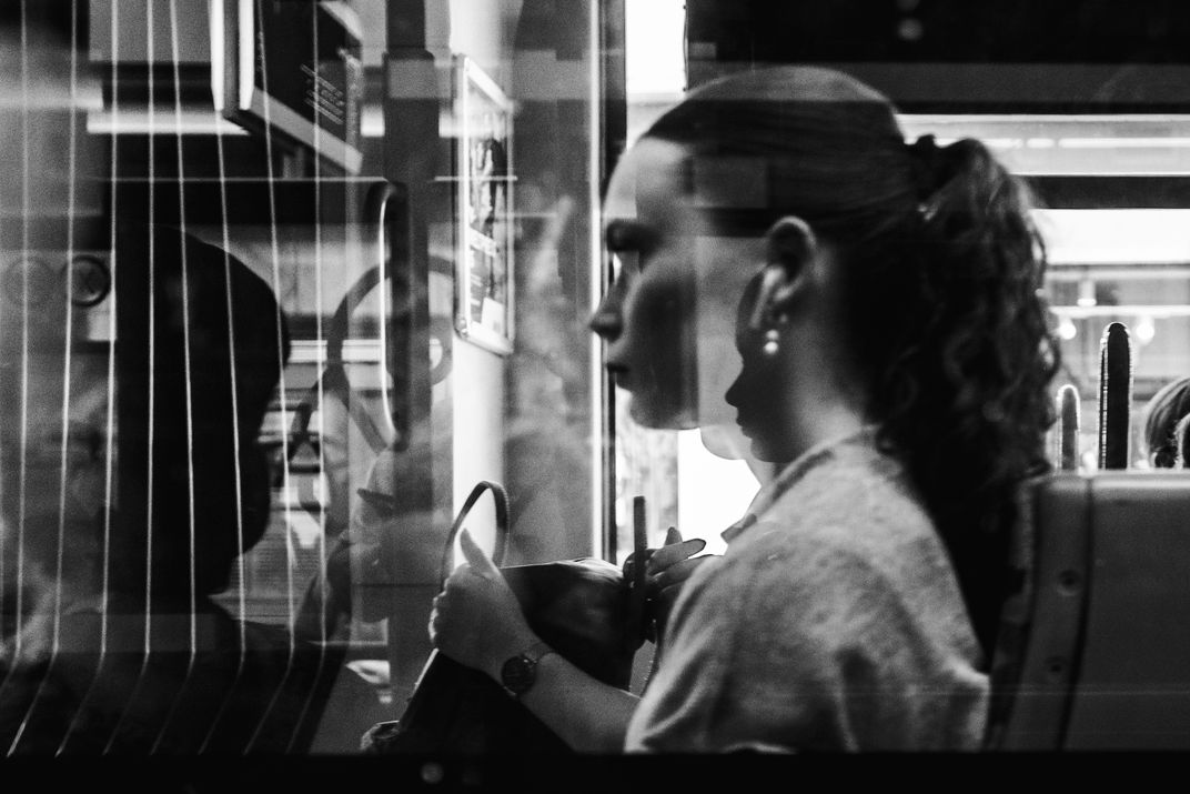 Photographed from inside a moving tram, this fleeting moment shows a young woman in an approaching tram, seen through multiple layers of reflections. Our paths crossed for an instant before continuing in separate directions.