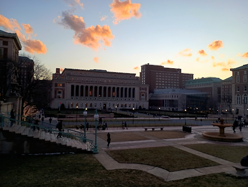 Columbia's motto is "In Your light We See The Light" but it fails to stand behind that mission in favor of financial gain and prestige. Thus, it blinds itself and the students it promised to lead as seen by the shadowy campus framed by a setting sun.