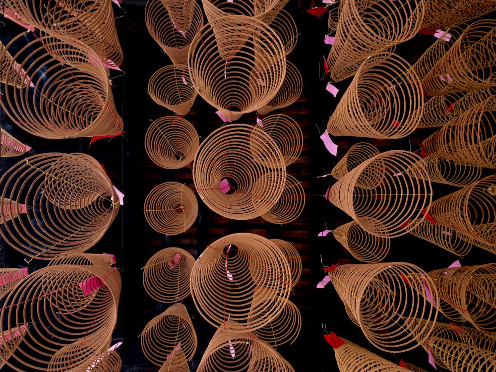 Incense coils hanging from the ceiling of a temple