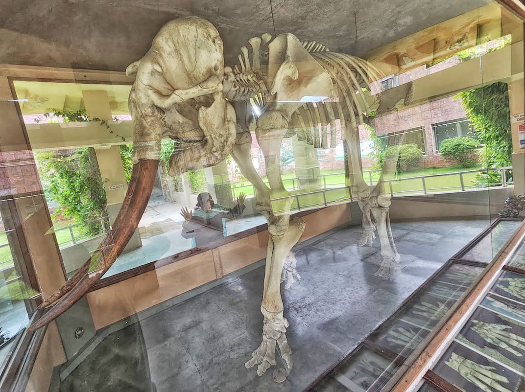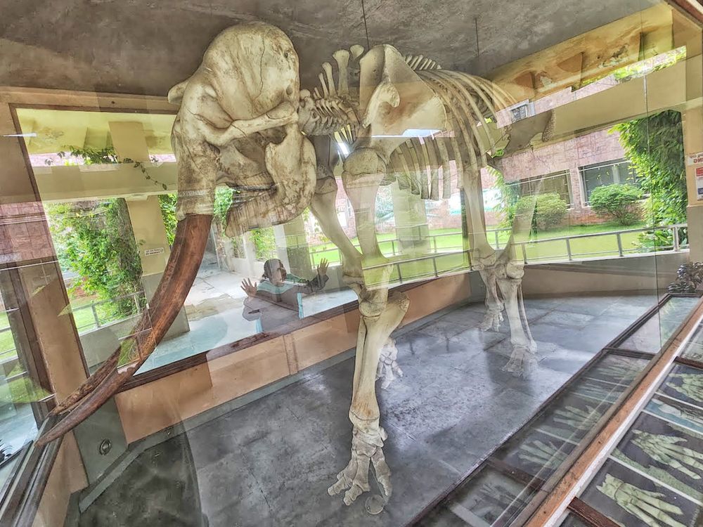 My wife is standing in front of a giant skeleton of Indian elephant in the Natural History Museum of Bhubaneswar in India while we were touring the state earlier this year.