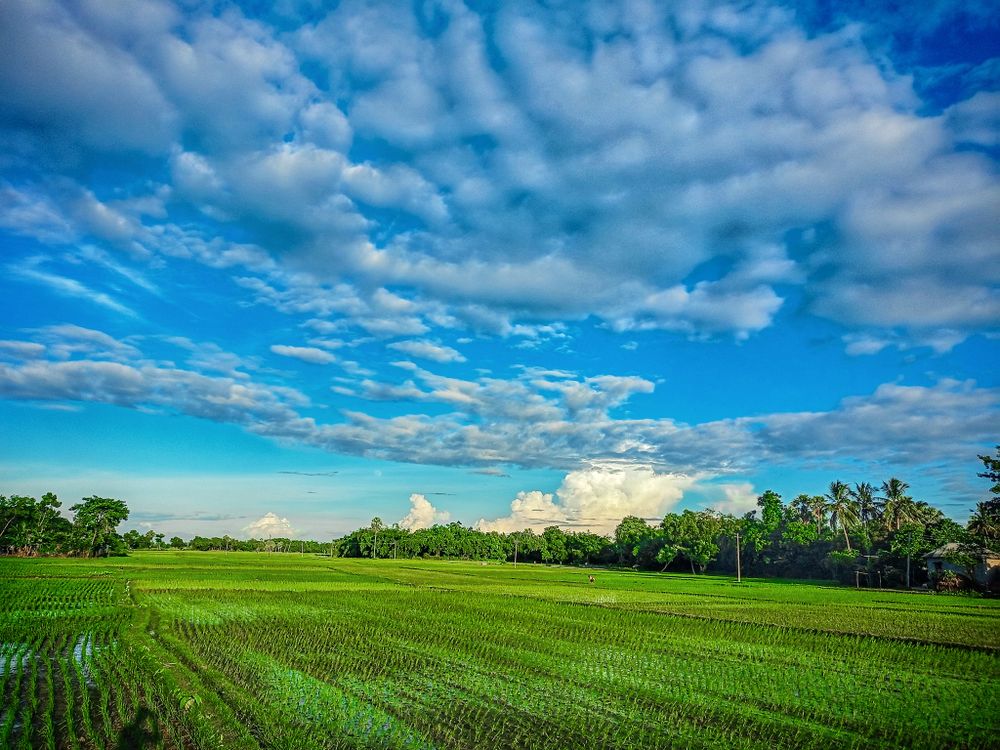 In this photo we looked the beauty of the indian nature. We looking this photo Down of Blue sky the fields that are full of green rice plants.
