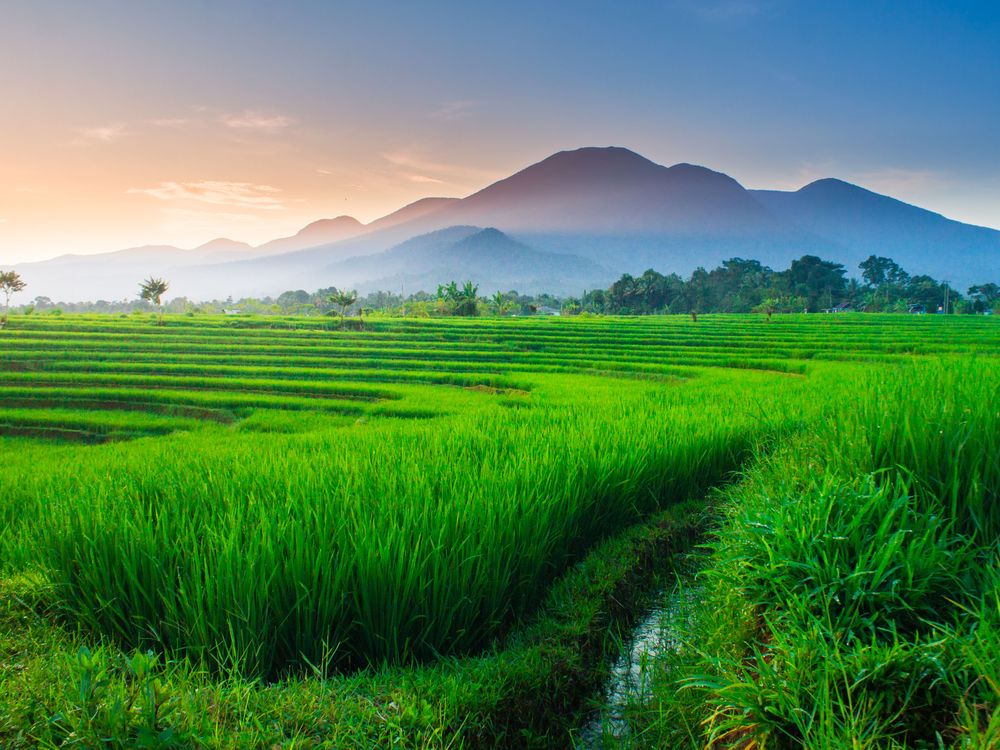 Indonesian natural beauty with a view of green rice fields as well as a hut of trees with beautiful composition. the beauty of the morning in the rice fields and the beautiful mountains on the mountain barisan in asia, the morning was so cold, before sunrise I set out and captured this beautiful moment, hope you guys like it, located in argamakmur area, bengkulu in kemumu village which is famous for its wide rice fields in Indonesia