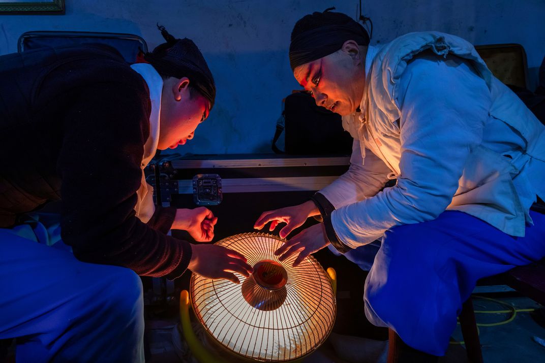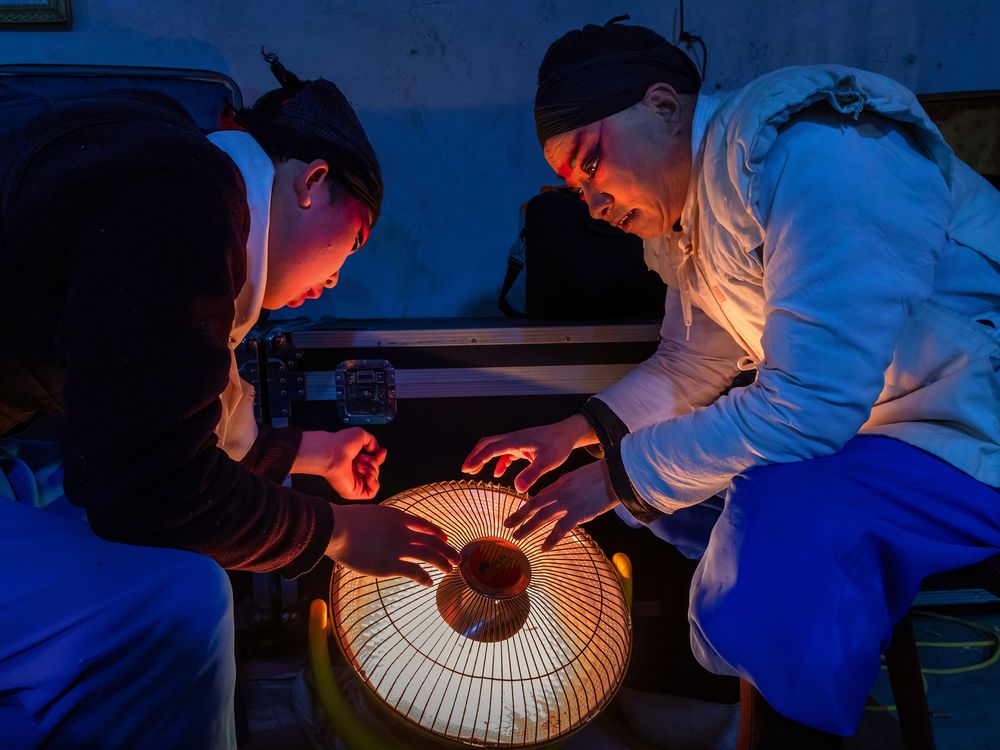 An experienced actor and a newcomer warmed themselves around an electric heater while sharing stage performance techniques and tips to help the newcomer grow quickly. The warm lighting created a cozy atmosphere.